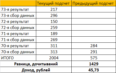 Всем привет! В последнее время мне всё сложнее и сложнее выкроить время на новую статью. Но я очень стараюсь не пропустить ни одной субботы и воскресенья. При этом мне не хочется, чтобы страдало качество статей, ведь я за них получаю "огромные" деньги: по 5-10 рублей. Да, это, конечно копейки, но после того, как я придумала, куда буду пристраивать эти "копейки", у меня появился азарт: ну а вдруг мне повезёт и когда-нибудь я выиграю в лотерею? Напомню, что моя задумка - покупать лотерейные билеты в качестве вознаграждение за ведение Марафона. То есть, я покупаю билет только с суммы, заработанной за прочтение статей о Марафоне. Да и то не всех, а последних восьми штук. Вот пожалуй, сразу и подсчитаю. Итого на мой лотерейный счет отправляется 45,73р. Это навар за три недели! А так как на счёте оставалось всего 3,74р, то теперь его баланс будет всего 49,47 - на покупку билета не хватает. Продолжаем копить. Ну а теперь переходим непосредственно к Марафону. Вот таблица прошлой недели: У мен