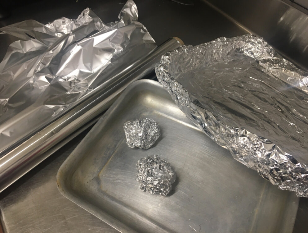 Также, удобно стелить фольгу на противень. В этом случае, его не нужно будет мыть после запекания. А если с противнями дефицит, то я всегда могу сделать ещё один из фольги. Для этого накладываю несколько слоёв фольги на противень нужной формы. Затем плотно обжимаю руками по форме противня. И, наконец, снимаю фольгу.