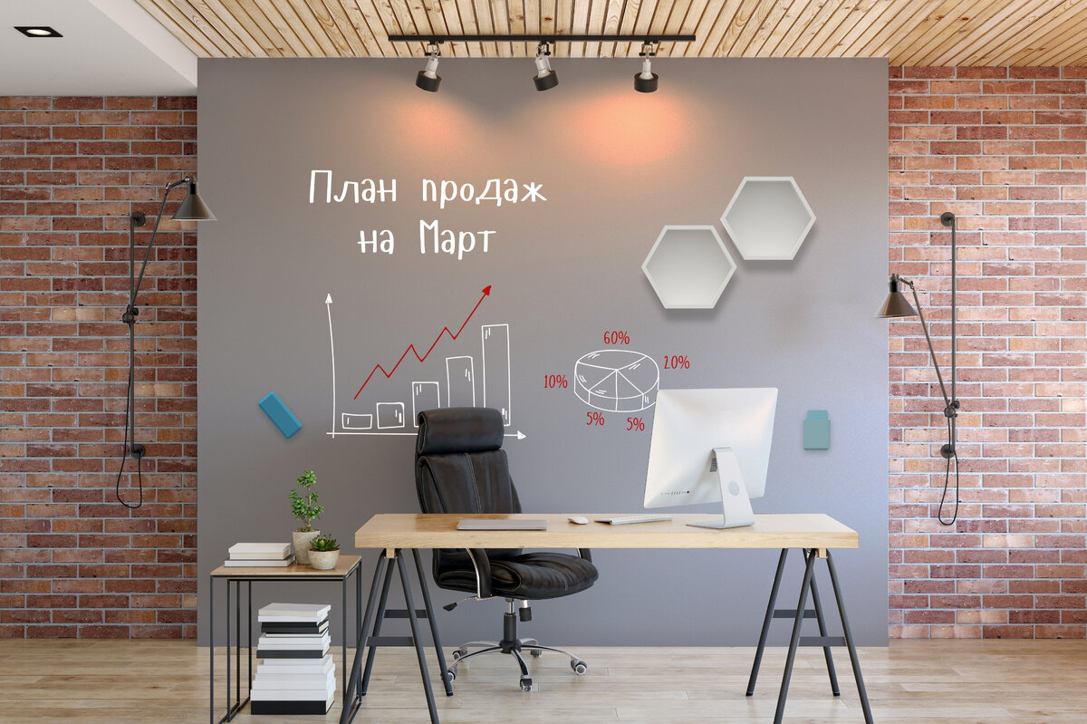 Здесь на помощь приходят магнитно-меловые/маркерные поверхности. Такое покрытие убьет сразу двух зайцев: станет элементом интерьера и незаменимым помощником в работе. Сейчас не будем говорить об устаревших маркерных досках и флипчартах, поскольку они громоздки и являются скорее необходимостью, нежели элементом интерьера.