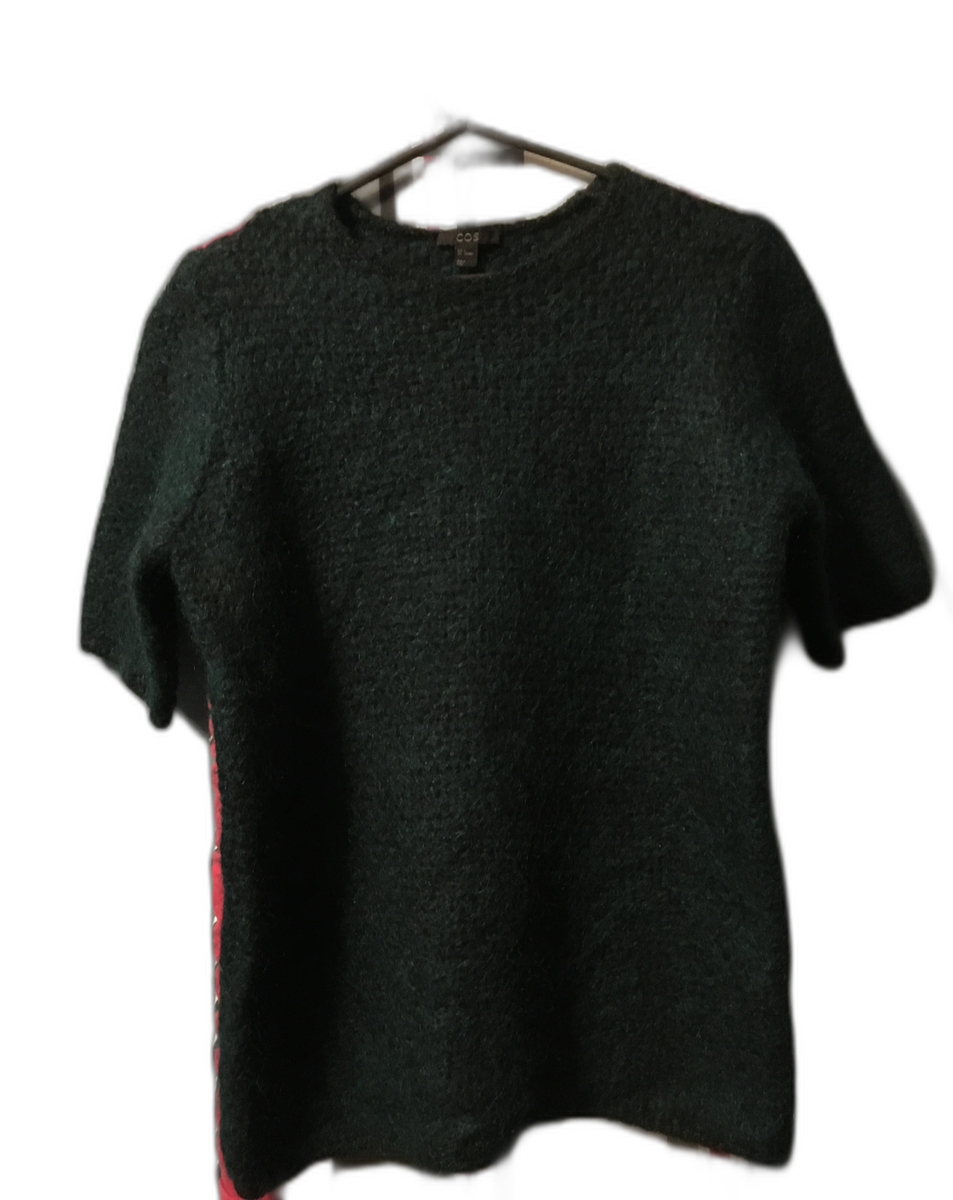 Забежала буквально на 10 минут на удачу. Перемерила несколько вещей. А потом мой взгляд привлекло что- то загадочное темно-малахитового цвета. Это оказался вязаный джемпер с короткими рукавами.