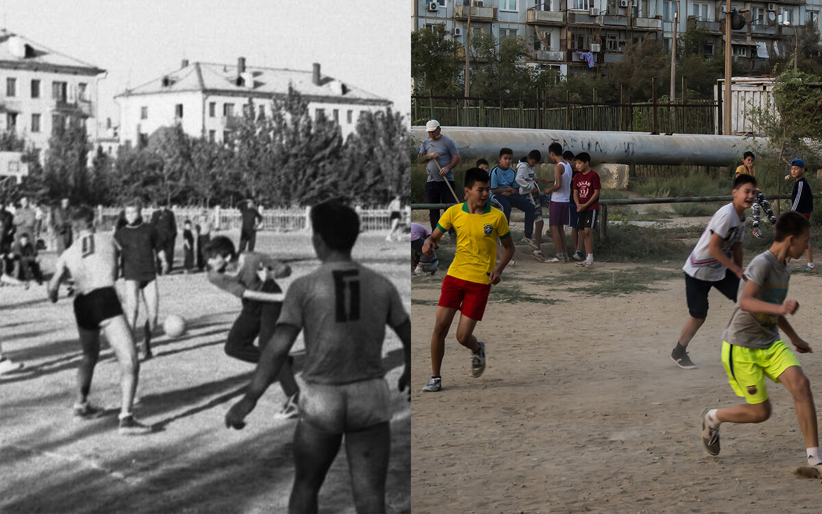 Байконур и сейчас будто замер где-то в 60-х, кажется, что в нем не изменилось вообще ничего. Именно такие ощущения складываются после прогулки по Байконуру. Но действительно ли не поменялось ничего? Я нашел старые архивные фотографии времен Гагарина и сравнил их со своими современными снимками космического города. Стелы на въезде в Байконур в разные времена выглядели по-разному. Официально это место сперва называлось заря, потом Ленинский, потом город Ленинск. И все это за десять лет. Попасть в город было практически невозможно, место было очень секретным. Сейчас на официальном въезде красуется название Байконур. Чтобы попасть в город нужен пропуск, но получить его все же проще, чем в советские годы. А это еще одна старая стела, которая официально называется "Невесомость". Но ее народное название "Рыбак" более забавное. По легенде, космонавт показывает руками рыбу, которую поймал :) Судя по всему, монумент реставрировали и сейчас он ваывглядит несколько иначе, но все в том же мозаичн