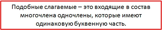 В некоторых многочленах одночлены могут соединяться знаком «минус». Например, 3x − 5y − 2x. Следует иметь ввиду, что это по-прежнему сумма одночленов. Многочлен 3x − 5y − 2x это сумма одночленов 3x, −5y и − 2x, то есть 3x + (−5y) + (−2x). После раскрытия скобок образуется многочлен 3x − 5y − 2x. 3x + (−5y) + (−2x) = 3x − 5y − 2x Соответственно, рассматривая по отдельности каждый одночлен многочлена, его нужно рассматривать вместе со знаком, который перед ним располагается. Так, в многочлене 3x − 5y − 2x минус перед одночленом 5y относится к коэффициенту 5, а минус перед одночленом 2x относится к коэффициенту 2. Чтобы не противоречить определению многочлена, вычитание можно заменять сложением: 3x − 5y − 2x = 3x + (−5y) + (−2x) Но это действие нагромождает многочлен скобками, поэтому вычитание на сложение не заменяют, учитывая в будущем, что каждый одночлен многочлена будет рассматриваться вместе со знаком, который перед ним располагается. Одночлены, из которых состоит многочлен, называ