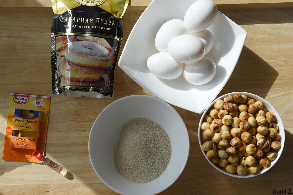 Простой и сытный пирог с насыщенным ореховым вкусом. Для орехового пирога понадобятся следующие ингредиенты. Яйца (С1) - 6 шт; Сахарная пудра - 125 г; Миндальный ароматизатор - 2-4 капли; Измельчённый фундук - 200 г; Панировочные сухари - 4 ст. л.; Порубленный фундук (для украшения) - 5-6 ст. л.; Разъёмная форма для выпечки диаметром 26 см. Подготовим все составляющие для орехового пирога. Измельчим фундук (предварительно можно слегка его обжарить). Поочерёдно в миску для взбивания добавляем пудру. Яйца. Несколько капель миндального ароматизатора. Всё взбиваем до светлой пышной массы. Затем добавим измельчённый фундук. Панировочные сухари. Всё хорошо перемешиваем. И, наконец, заливаем в форму для запекания, предварительно смазанную маслом и слегка присыпанную панировочные сухарями. Оставляем выпекаться в разогретой до 200 градусов духовке примерно 25 минут. Пока выпекается пирог можно порубить фундук. И сразу же, как только достали пирог из духовки, присыпаем его порубленным фундуком
