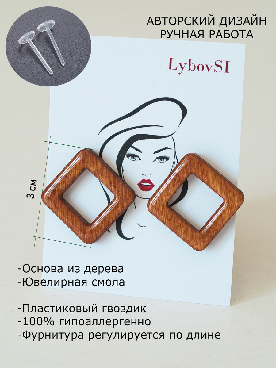 Я сохранила уникальный рисунок дерева, лишь подчеркнув его фактуру. Серьги смотрятся очень дорого и стильно. Легкие и невесомые. Фурнитура - ПЛАСТИКОВЫЙ гвоздик. Не вызывает раздражений. В комплекте имеется пара пластиковых прозрачных заглушек. Гвоздик можно подрезать по длине. Гвоздик закрывается силиконовой заглушкой, которая плотно сидит и не дает сережке потеряться. Покрыты серьги ювелирной смолой. Размер сторон -2 см. Серьги крепятся на авторскую подложку. Упакованы в крафтовую коробочку. Станут желанным подарком для любой женщины. Главная миссия моих украшений - подчеркнуть женскую красоту. Чтобы каждая из вас чувствовала себя свободной и легкой в этих украшениях. С уважением, LYbovSI. 100% ГИПОАЛЛЕРГЕННО Высота 2 см, ширина 2 см, толщина 3 мм; Фурнитура- ПЛАСТИКОВЫЙ ГВОЗДИК. Серьги ромбы с текстурой дерева. Приобрести можно только на Wildberries бренд LybovSi Доступны по поиску артикула 37373454 Стоимость уточнять на самом сайте.