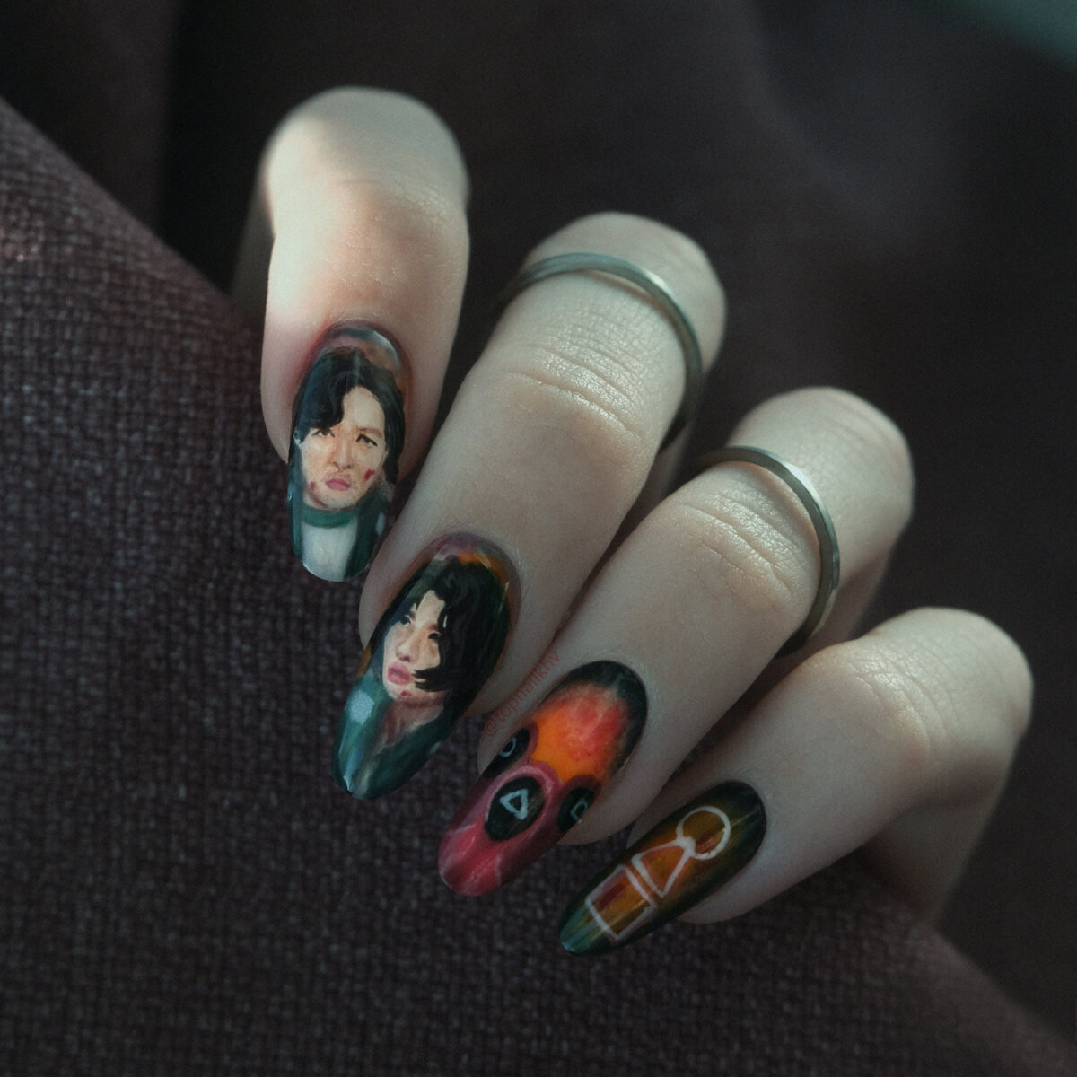 Я очень люблю выполнять роспись на ногтях, обычно рисую веточки, цветочки, котиков, в общем что-то «обычное». Но сегодня на меня напало вдохновение😄 За 3 часа нарастила двойку и разрисовала все ногти в стиле сериала «Игра в кальмара». Такого в моем портфолио еще не было😍 Кстати, сериал крутой, посмотрела всё за 2 дня👍🏻