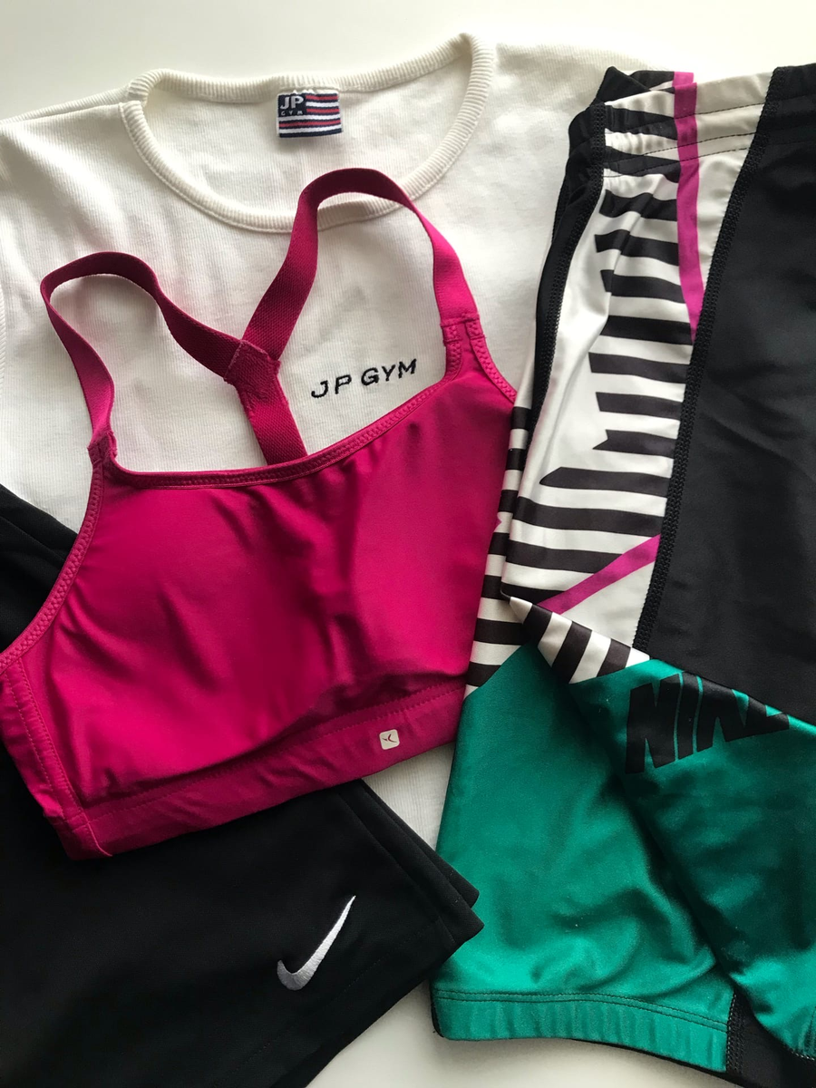 Я тренируюсь в домашних условиях по видео или сама придумываю различную активность. И даже дома надеваю спортивную форму и кроссовки обязательно. Это очень важный пункт в разделе мотивации. Если вы настроились на домашнюю тренировку, но остались в пижаме или в домашней одежде, тренировка пройдёт не очень хорошо. Заметила на себе, когда надеваю спортивную форму, тренироваться хочется больше и дольше. Особенно, если спортивная одежда яркая и красивая и в этом уже поможет секонд-хенд. В секонд-хенде множество спортивной одежды даже на максимальных скидках. Это позволяет купить несколько комплектов спортивной формы и надевать её под настроение. Весь мой набор обошёлся мне примерно в 700 рублей, если бы я купила подобное в Спортмастере, это вышло бы больше 10 тысяч рублей. Вот моя коллекция спортивных вещей для моих домашних тренировок: 1. Яркий розовый топ. Конечно в тренажерный зал я бы носила его как спортивный лифчик, под футболку, а дома можно и как самостоятельную вещь. Стоил 50