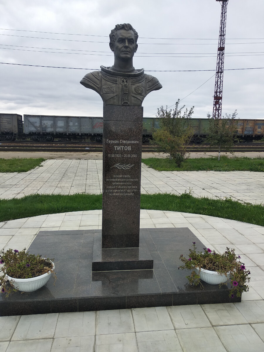 Тут же и Ленин и космонавт Титов. На привокзальной площади также обнаружена занятная водонапорная башня, в её окнах присутствует звезда Давида, хотя судя по истории иудейского населения тут не было. Город основан в 1937 году выходцами из Харьковской губернии, также тут до 1941 года проживало достаточно много поволжских немцев, но иудеев не было.