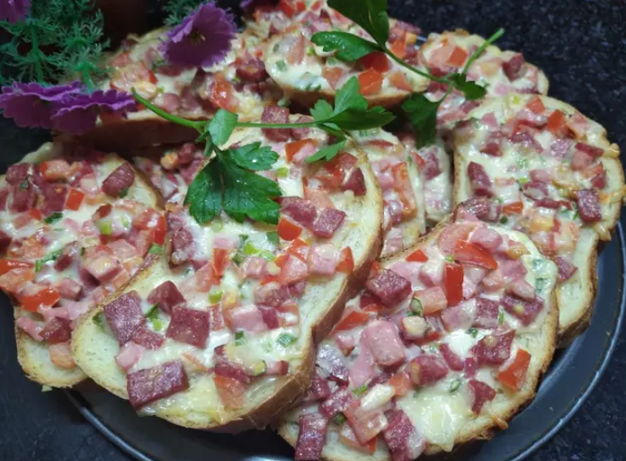Наверняка у каждого человека возникают ситуации, когда нужно что-то очень быстро приготовить. Например, нужен быстрый и вкусный завтрак, а времени катастрофически не хватает. Вот тут и придут на помощь горячие бутерброды. Готовятся они очень быстро и просто, и требуют минимум ингредиентов. Ингредиенты: Приступим к готовке Первым делом включаем духовку на 180°, и пока она разогревается, приготовим начинку для бутербродов. Для этого колбасу и помидоры нарезаем мелким кубиком, сыр натираем на крупной тёрке, чеснок - на мелкой тёрке (по желанию), а зелень или зелёный лук мелко шинкуем. В миске соединяем нарезанные продукты, добавляем майонез. Тщательно перемешиваем начинку для бутербродов. Батон нарезаем ломтиками. Выкладываем начинку (по 1-2 ст.л.) на ломтики хлеба. Ставим мини-пиццы из хлеба с колбасой, помидорами и сыром в разогретую духовку на 8-10 минут. Горячие бутерброды готовы! Хрустящие ломтики хлеба и сочная начинка из колбасы, помидоров и сыра - идеальный сытный завтрак на скору