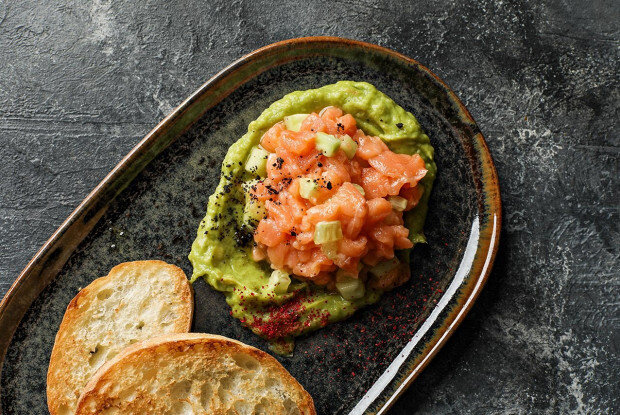1.Авокадо очистить от кожуры и косточки, нарезать и положить в блендер, добавить сок лайма, 2 грамма морской соли, перец чили, 15 грамм оливкового масла и смешать. 2.Добавить в получившуюся смесь мелко нарубленный помидор. Масса должна получиться кашеобразной консистенции (гуакамоле). 3.Лосось порезать мелким кубиком, добавить очищенный от кожуры огурец, порезанные мелким кубиком огурец и лук шалот, соевый соус, лимонный сок, 15 грамм оливкового масла и 1 грамм морской соли. Перемешать. 4.Параллельно поджарить в печи до румяного цвета два кусочка чиабатты. 5.Выложить на тарелку гуакамоле, в центре выложить замаринованный с ингредиентами лосось, с края выложить 2 кусочка чиабатты, декорировать высушенными маслинами, мелко порубленными ножом. Любите читать Дзен «Еды»? Расскажите свое мнение о материале в комментариях и ставьте свои лайки!