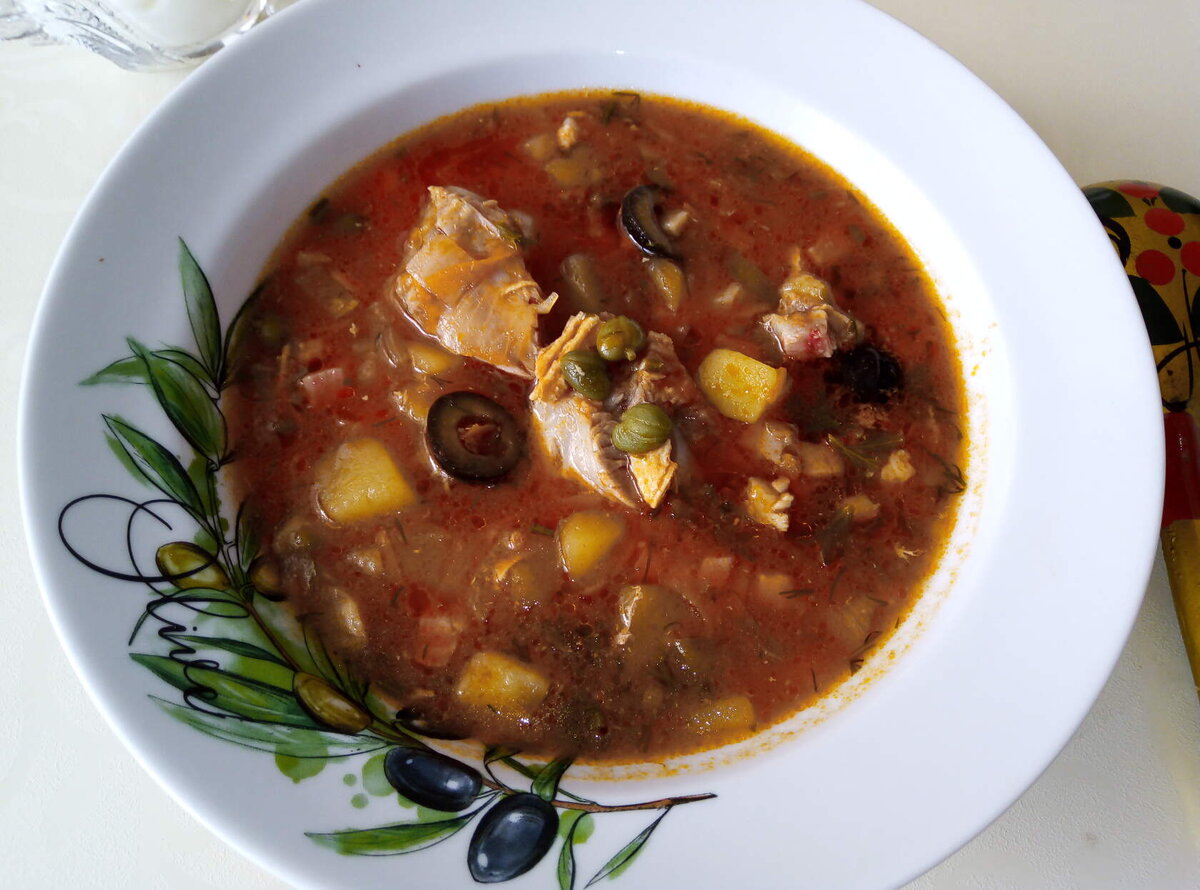 Ингредиенты 500 гр свинины с косточкой 500 гр бедро курицы 300 гр копченой корейки (или любое копченое мясо) Картофель – 5-6 шт. Капуста – 300-400 гр. Маслины без косточек – 1 банка Болгарский перец красный – 2 шт. Свекла – 1 шт. Чеснок – 1 головка Укроп, кинза, базилик – 1 пучок Уксус яблочный – 2ст.л. (или сок лимона) Сахар, соль, специи – по вкусу Приготовление: 1. В кастрюлю, предназначенную для варки 1-ых блюд, положить порезанные ломтиками свинину и курицу, залить холодной водой, поставить на огонь, как закипит – снять пену. Капусту - нашинковать, очищенный картофель - нарезать соломкой, и все добавить в кастрюлю. Варить на медленном огне до готовности мяса. 2. В глубокую сковороду налить подсолнечного масла. Пока разогревается сковорода, порезать соломкой копчености, очищенную свеклу и болгарский перец. Нарезать колечками маслины. Мелко порубить чеснок и зелень. Все сложить в сковороду, добавить уксус, сахар, соль и тушить на медленном огне до готовности (ориентируемся по мягко
