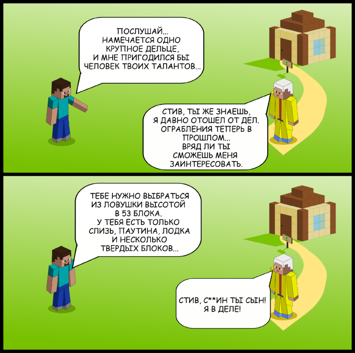 В этом выпуске вы узнаете, как подготовить базу к Хэллоуину, как выбраться из глубокой ямы в коренной породе и как облагородить Край. Одиннадцать друзей Стива Смотрели когда-нибудь фильмы про ограбления? Главный герой там всегда начинает с того, что собирает команду спецов с особыми умениями. По тому же пути пошел и Стив. А вот и само испытание: Слишком много тыкв не бывает Уже украсили свою базу к Хэллоуину? Только не переборщите! Квартирный вопрос Дракона Края Некоторые постройки настолько шикарны, что полностью меняют привычные структуры: К сожалению, самого хозяина жилплощади в ходе реновации пришлось усмирить — мешал рабочим расставлять блоки.