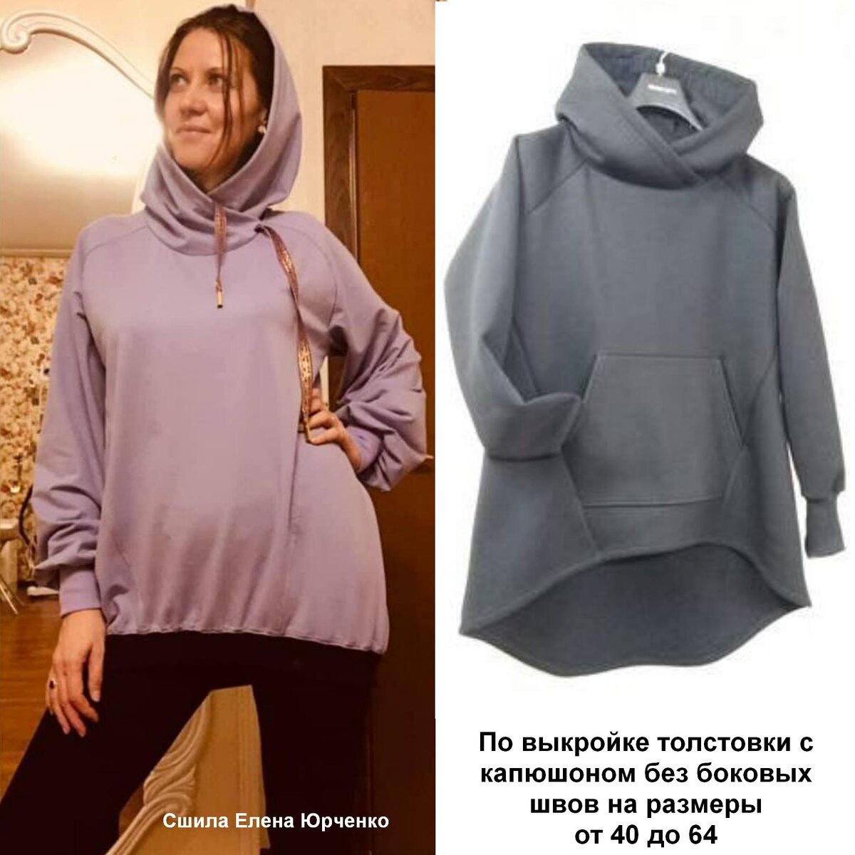 Своим вариантом сшитой по выкройке толстовки с капюшоном без боковых швов поделилась Елена Юрченко: "Сшила худи по вашей выкройке. Выкройку не меняла, не пришивала карман, добавила манжету и на низ резинку кашкорсе, шила из футер двунитка. Подкладка в капюшон - кулирка. Размер 48. Сайт очень удобный всё понятно. Инструкцией не пользовалась, опыт в пошиве есть. Примерок не было, сшила и надела). К пальто наверное воспользуюсь инструкцией, хотя тоже должно быть всё понятно. Всё супер." Как на мой личный взгляд, то добавление резинки в этом фасоне и не пришивание кармана Еленой, не лучшим образом отразилось в этой модели толстовки с капюшоном. НО, тут дело личных предпочтений и каждый шьющий вправе вносить любые изменения в фасон на свой вкус! Мне больше нравится вариант отшитый подписчицей Татьяной Московской, которая не вносила никаких изменений, а сшила двуцветную толстовку: Или одноцветный вариант без изменений от Светланы Макеевой: А также очень красивый и стильный вариант без измен