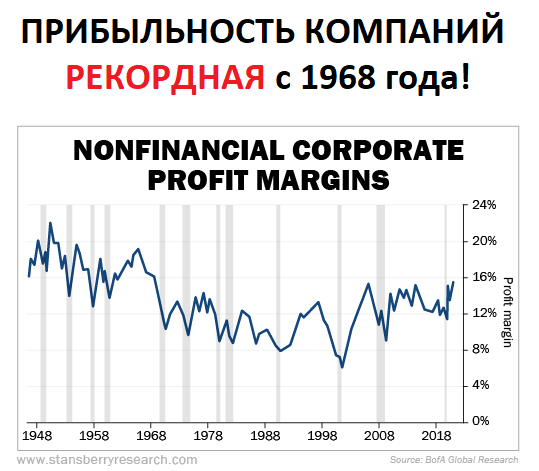 Типичные инвесторы на фондовом рынке всегда боятся. Разумные инвесторы смотрят на факты. И факты говорят о том, что прибыльность американских компаний РЕКОРДНАЯ с 1968 года! Причем компаний не-финансовых: то есть предоставляющих РЕАЛЬНЫЕ блага - промышленность, потребительский сектор и т.д. Причины? Очень простые! 1) Бурное восстановление экономики после пандемийных опасений. 2) Рост потребления обусловленный существенным количеством денег (и качественный бизнес может извлекать максимум прибыли из этого роста количества денег и роста инфляции). 3) Эффективное управление капиталом и потребительским спросом, эффективные бизнес-модели американских компаний. Обратите внимание: мы ведем речь о реально крутом росте прибыльности. Это не рост капитализации или рост коэффициентов. Это реальная прибыльность, которая конвертируется в реальные выгоды для владельцев бизнеса (и для нас с вами, как владельцев акций). Пока типичные инвесторы пребывают в панике ожидания кризисов, разумные ин