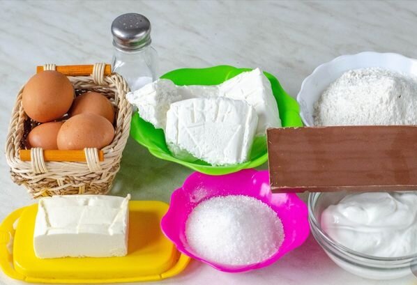 Идеальное сочетание нежнейшей творожной начинки, песочного теста и молочного шоколада. Такой творожный пирог с шоколадом непременно покорит вас с первого кусочка. Попробуйте приготовить. Нам понадобится : -Мука пшеничная – 250 г -Масло сливочное – 100 г -Сахар – 130 г -Соль – 1 щепотка -Яйца – 4 шт. -Сметана – 180 г -Творог 9% – 300 г -Шоколад молочный – 100 г Для украшения (по желанию): -Шоколад молочный – по вкусу Шаг 1 Подготавливаем продукты. В процессе готовки нам понадобится кипяток. Шаг 2 Разбиваем яйцо и аккуратно отделяем желток от белка. Шаг 3 Сливочное масло нарезаем кубиками. Шаг 4 К сливочному маслу просеиваем муку. Шаг 5 Руками перетираем масло с мукой в крошку. Шаг 6 К мучной крошке добавляем желток, 1-2 ст. ложки сметаны, 50 г сахара и соль. Шаг 7 Замешиваем нелипкое тесто. Шаг 8 Оборачиваем тесто пищевой пленкой и отправляем в холодильник на 40 минут. Шаг 9 Включаем духовку для разогрева до 200 градусов. Дно разъёмной формы (диаметром 18-20 см) застилаем пергаментной