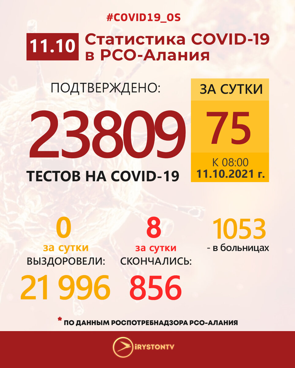 По данным Роспотребнадзора РСО-Алания на 08:00 11 октября 2021 года в Республике Северная Осетия-Алания зарегистрировано 23 809 (+ 75 за сутки) случаев заражения новой коронавирусной инфекцией.