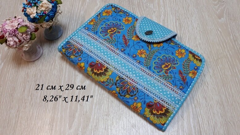 Многие мастера очень трепетно относятся к своему инструменту, у кого-то есть спицы еще с советских времен, а кто-то имеет в арсенале японские, дорогие инструменты, но все это богатство требуется где-то хранить - вот такой органайзер-папка будет отличным местом для Вашего большого запаса)))))))) Сшит органайзер из Ивановской бязи - двух цветов, для отделки использовался голубой гипюр. По периметру папка обшита косой бейкой. Внутри, на разворотах отделения для спиц и крючков, а для других вязальных принадлежностей есть прозрачный, вместительный карман. Я специально не стала делать дополнительные отделения на обратной стороне кармана, чтобы его не оттягивало, но по желанию, если стенку кармана дополнительно уплотнить, можно и там сделать ячейки... Основные стенки папки будут укреплены листами фетра. Все размеры деталей указаны в сантиметрах и дюймах, кому как удобнее. Бязь для основы и карманов вырезаю на 1 см шире, чем фетровая основа. Внутри карманов для уплотнения использовалась виск