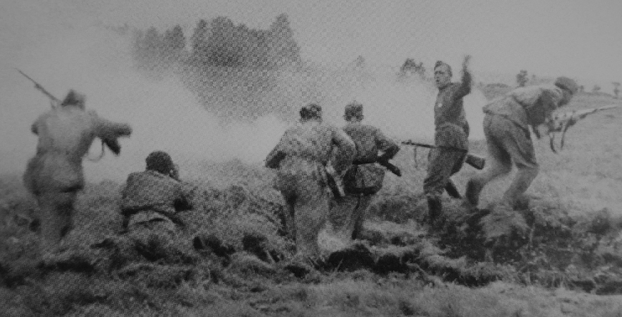 Дивизия наступала в направлении на Ельню. Запомнил название деревни на этом направлении-Семёновка. Данная деревня 3 раза переходила из рук в руки. В очередной раз немцы нас выбили из деревни. Окопались в 3 км от деревни. Последовала немецкая танковая атака из 40 машин. Все моментально побледнели и приготовились умирать. Тяжелый очень бой. Наши батальоны кровью истекают, начали отходить. Связь с батареей пропала, напарников двух убило. Если остаться, то точно немцы убьют. Отступали к деревне Горские Хутора. После войны такой деревни уже не нашел. В этот период произошел эпизод незабываемый, все в нем смешалось-и трагедия и комедия. Снова пришел приказ атаковать противника. Все начиналось хорошо. Сходу продвинулись на несколько километров. Выдвигался со связистом сразу за пехотой. Тащили на себе тяжелые катушки с проводом. Потом началось. Немцы ударили с фланга и отрезали наш батальон. Назад уже не отойти, фрицы положат. С большой группой пехоты решили прорываться к ближайшему лесу.