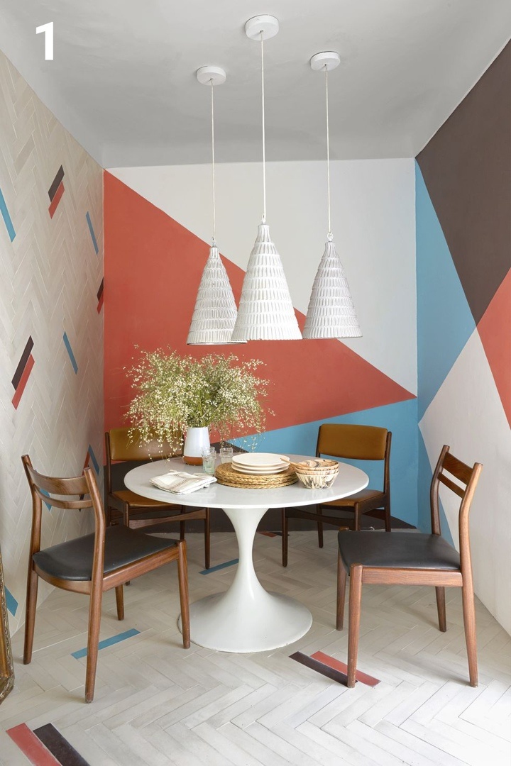 В этой марокканской столовой полы и одна стена покрыты геометрической плиткой Popham Design Baguette, а две другие стены окрашены абстрактными фресками, отражающими те же цвета и формы.