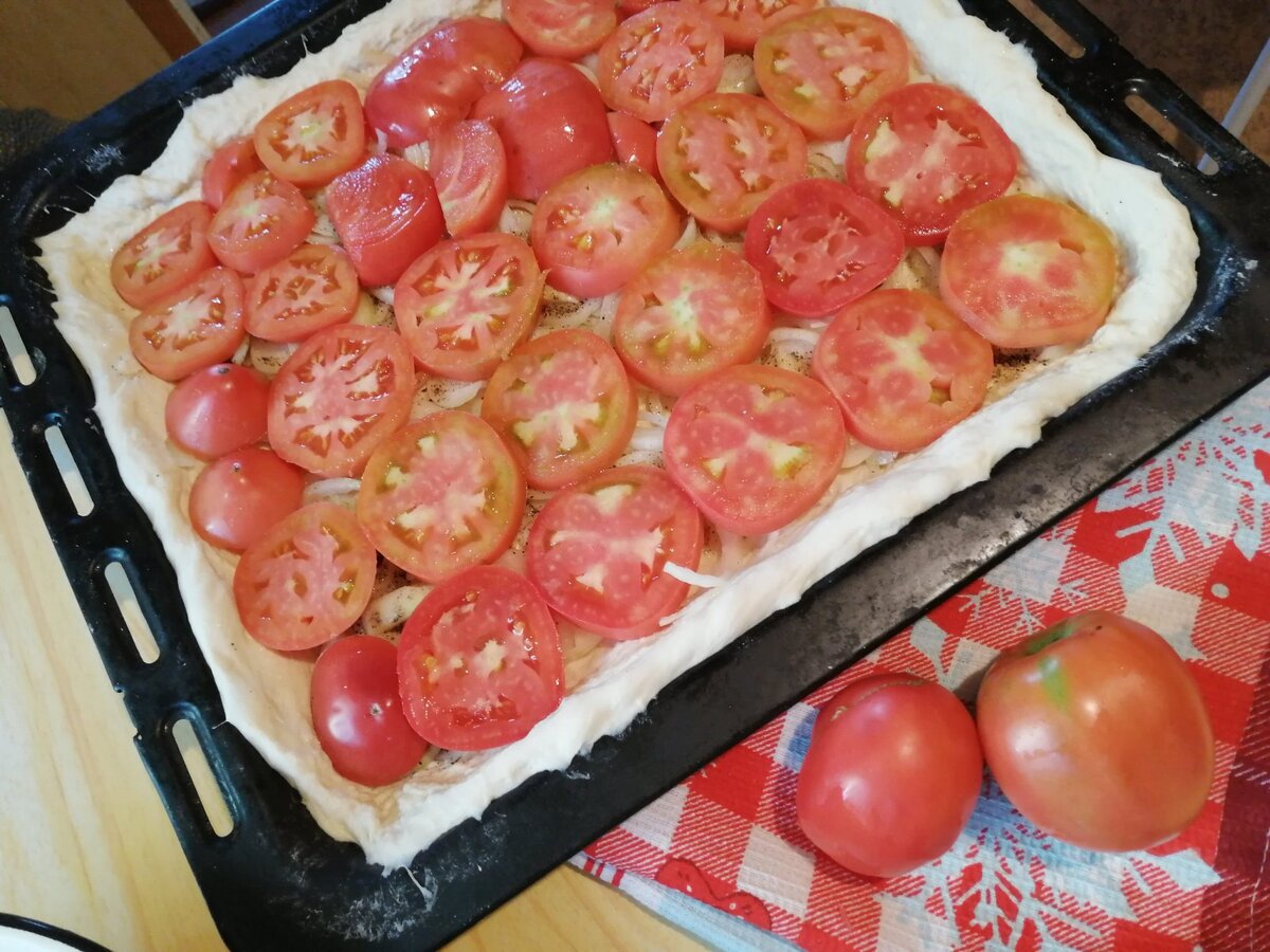 Кусочек сливочного масла для смазывания Приготовление: Противень слегка смазать маслом, разложить примерно 1 кг теста так, чтобы получились бортики. Нарезать кольцами лук и помидоры, лук разобрать на маленькие колечки. Укладываем овощи в 3 слоя. Первый слой – колечки лука, их солим и перчим. Второй слой – помидоры, их солим и перчим. Третий слой – снова лук, который снова солим и перчим. В специях главное баланс. Если хочется поострее – можно побольше перчика. Сверху накрываем оставшимся тестом. В центре делаем дырочку, чтобы выходила лишняя в