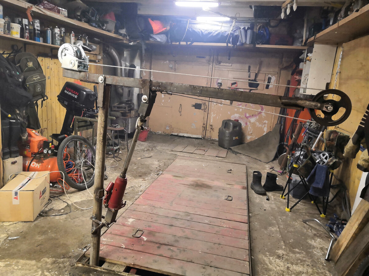Данную конструкцию собирал аж с лета. Самое главное для меня во всей конструкции было то, чтобы она могла вращаться на 360 градусов вокруг своей оси и могла быть легко демонтирована за ненадобностью, чтобы не мешалась в гараже. И чтобы лебедку и домкрат можно было использовать в других целях. Некоторые узлы конструкции приходилось переделывать, потому как либо криво встало, либо вообще не работает в данном положении. В итоге получилась вот такая хрень: Из нового металла куплена лишь профильная труба 50х50, две круглые трубы купил на металлоприёмке. Одна труба длинной 2 метра на 50 мм, вторая труба - 65 мм и длиной 1 метр (её я приварил к углу смотровой ямы) и в нее уже вставляется длинная труба. Некоторые части моего "колхоза" взяты от старого велосипеда сына: Домкрат установлен на площадку с четырьмя шпильками для крепления, площадка приварена к куску профильной трубы, к концу профильной трубы приварена водопроводная труба, в которую вставлена еще одна трубка для обеспечения свободног