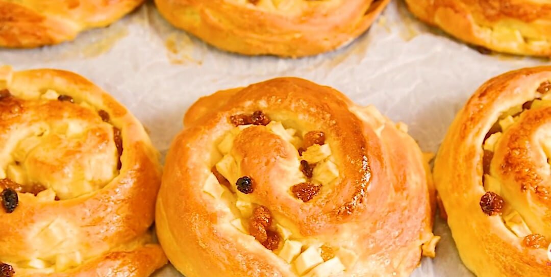 Ингредиенты Тесто: Начинка Булочек: Преступим к приготовлению В миску наливаем 300г теплого молока. Добавляем 3 ст.л. сахара, и маленькую щепотку соли.Хорошо перемешиваем. Добавляем 25г свежих дрожжей.(если сухие дрожи то 8г). И снова перемешиваем. Разбиваем в миску 1 яйцо. Чайную ложку ванильного экстракта либо ванильного сахара. Вливаем 3 ст.л. растительного масла. Постепенно просеиваем 600-650г муки. Собираем тесто в шар. А пока подходит тесто, очищаем от кожуры 3 яблока. Разрезаем яблоки на 4 части и вырезаем семена. Нарезаем яблоки маленькими кубиками. Выкладываем тесто на стол посыпанной мукой и раскатываем в большой пласт. Смазываем раскатанное масло мягким сливочным маслом и посыпаем сахаром. Сверху посыпаем тесто изюмом. Раскладываем яблоки. Сворачиваем вот в такой рулет. Обычной ниткой нарезаем рулет на булочки. Донышко каждой булочки обмакиваем в муку. Кладем на противень. Накрываем целлафановым пакетом, сверху прикрываем полотенцем и оставляем минут на 20-30. Аккуратно