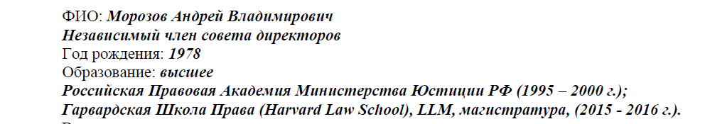 После некоторого перерыва продолжаю серию статей о советах директоров публичных акционерных обществах, их персональном составе. Предыдущая статья: Если мы рассмотрели генерального директора ассоциации профессиональных инвесторов (АПИ), то логично было бы перейти к юридическому директору этой организации, Андрею Морозову. Его, как и Александра Шевчука, поддерживает одна группа иностранных акционеров и зачастую они входят в совет директоров одних и тех же компаний. У Морозова Андрея высшее отечественное и западное юридическое образование: В отличии от своего генерального директора, он менее публичная фигура. Даже чтобы найти его фотографию пришлось немного потрудиться. В настоящее время Морозов Андрей Владимирович входит в состав двух публичных акционерных обществ: 1. ПАО "Россети Волги". член Комитета по аудиту, член Комитета по стратегии Вознаграждение: где-то 2 000 000 руб в год. 2. ПАО "МРСК Северо-запад". член Комитета по надежности, член Комитета по стратегии. Вознаграждение: где-