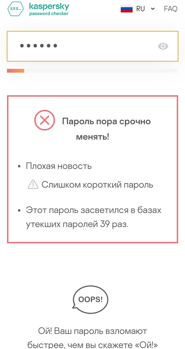 Когда хакеры подбирают пароль от вашего аккаунта — они используют специальный софт по подбору. Насколько быстро у них получится сделать это, зависит от сложности пароля. Если он длинный и непопулярный — это займёт вечность. Но если нет (что чаще всего и происходит), есть риск потерять доступ к своим аккаунтам. Kaspersky Password Checker - Данный сервис покажет, сколько минут, часов или лет понадобится, чтобы взломать ваш пароль. Лучше не вводить свой настоящий пароль, а заменить в нём пару символов. Хотя это надёжно и сервис не хранит пароли, лучше перестраховаться. На результат проверки это всё равно не повлияет. Ещё полезная фича: проверка показывает, сколько раз ваш пароль встречался в базе утечек. Также рядом будет подборка из интересных фактов о паролях. Например, если для подбора потребуется 9784 века, за это время «Бендер Родригез («Футурама») успеет спереть всё сущее в этой галактике, включая ваш пароль». утечки