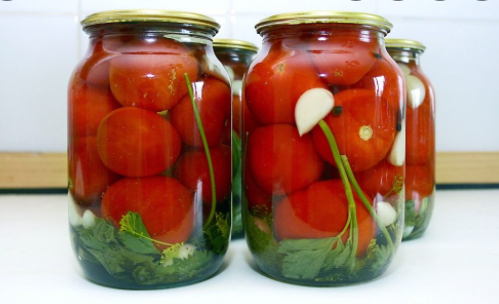 Здравствуйте! Сегодня я поделюсь с вами рецептом консервированных помидоров на зиму. Сколько рецептов я не перепробовала, но этот оказался самым лучшим. Помидорки получаются просто шикарными, идеальны для закуски, а рассол получается просто чудесный. Первым делом мы стерилизуем крышку и банку. Берем сразу же хороший пучочек петрушечки и засовываем в банку. Следующее мы закладываем чеснок. Два зубчика чеснока достаточно. Если порезать, он отдаст лучше аромата. Режем лук напополам. Закладываем только половину в банку. Лук потом можно будет есть, получается очень вкусный. Дальше закладываем морковь. Половину моркови режем на кусочки и кладем в банку. За ней идут перцы. Его надо совершенно чуть-чуть. Можно класть разноцветные, для красоты. Для остроты рассола кладем острый перец. Дальше смело забрасываем плотненькие чистенькие помидорчики. Важно, чтобы они были не побитые, а то лопнут в банке. Помидоры кладем аккуратно, чтобы не помять. Когда заполнили банку помидорами, можно добавить у