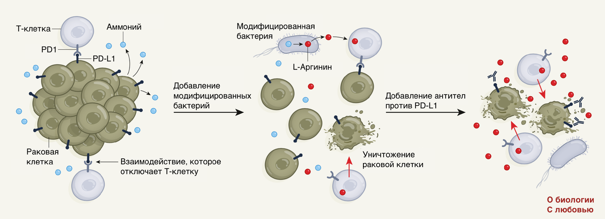 Кратко Ученые из Швейцарии вместе с коллегами из Кембриджа создали штамм кишечной палочки, который использует копящийся в опухоли аммиак для синтеза L-аргинина, которым питаются Т-клетки. Для этого они удалили из бактерий ген, подавляющий синтез аргинина. И заменили обычный ген фермента, который синтезирует аргинин, на вариант, кодирующий фермент, который производит аргинин даже когда его много. В эксперименте на мышах колонизация опухоли модифицированными бактериями повысила местную концентрацию L-аргинина в 14 раз. В результате туда прибыло в два раза больше Т-клеток. Авторы исследования заметили, что опухолевые клетки всё равно блокировали активность многих Т-клеток. И правда, раковые клетки пользовались тем, что белок PD1 (программируемой клеточной гибели) Т-клеток может останавливать их работу. Клетки рака вырабатывали и выставляли на поверхности PD-L1 – лиганд, который активировал PD1, связываясь с ним. В результате PD-L1 подавлял работу Т-клеток, делая опухолевые клетки неуязвим