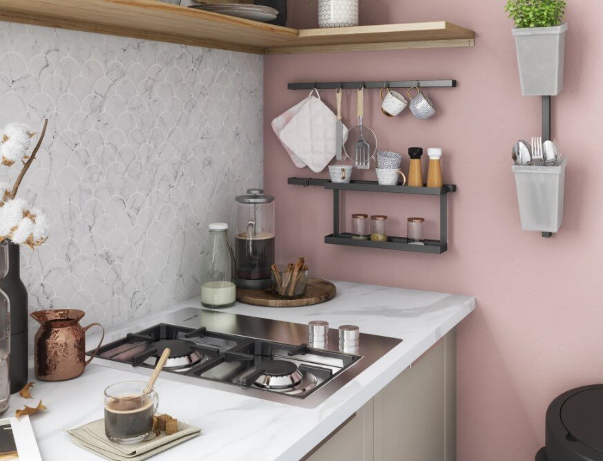 Когда единой системы организации вещей нет, поддерживать порядок на кухне бывает трудно. Приходится регулярно расхламляться, делать генеральные уборки и тратить на это собственное свободное время. С правильным хранением за порядком не придется как-то специально следить, потому что кухонное пространство станет удобнее, а у каждой вещи появится свое место. Организовать такую систему можно на любой кухне, и это совсем несложно. Например, если вы только планируете ремонт, то лучше сразу продумать, что и как вы будете хранить. Если нужно быстро преобразить уже готовую кухню, то вот четыре базовых совета от специалистов Леруа Мерлен. 💡 Установите рейлинги Они хорошо экономят пространство, которого всегда так не хватает на полках и столешнице. Особенно это чувствуется на небольших кухнях, где важен каждый сантиметр рабочей зоны. На рейлинге удобно держать под рукой предметы, которыми вы пользуетесь чаще всего: любимую кружку, лопатку или ножницы. Когда они понадобятся в следующий раз, можно