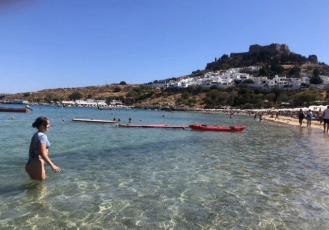 Приехав в Линдос, Шон пробирался по забитым дорогам и узким аллеям, пока не нашел место для нашей парковки. Я была так благодарна, что он был за рулем! После быстрой остановки, чтобы купить мороженое, мы спустились к пляжу - он был потрясающим. Ближайшие к пляжу шезлонги и зонтики были арендованы, но мы нашли ряд невысоких деревьев, которые давали тень бесплатно и при этом давали нам прямой вид на воду. SCORE! Тропическая музыка играла из ресторана тики позади нас, пока мы читали наши книги и наблюдали за людьми. Это было похоже на то, как я представляю себе пляжный курорт на Гавайях, только здесь "5 звезд" были с акрополем в качестве потрясающего фона. Мы купались в океане, где лодочники, любители снорклинга и паддлбординга также наслаждались теплой водой. В конце концов, пришло время уезжать.