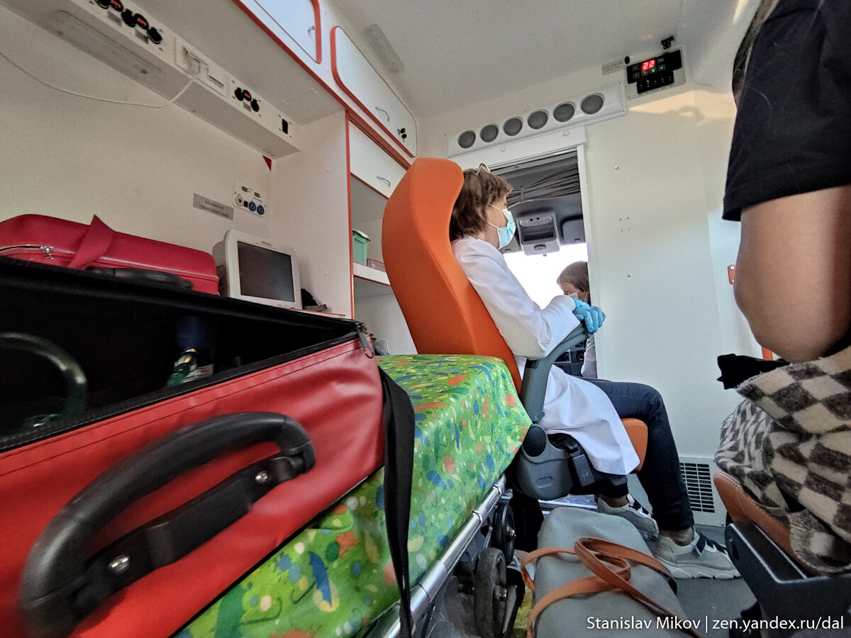 Бригада СМП оказалась не простой. Это была детская скорая. Бодрая и весёлая врач в розовом халате, с первой секунды посмотрев на пострадавшую, радостно провозгласила «а, ну всё ясно», завела её в машину, успокоила, опросила, дала конфетку, измерила давление, сделал какой-то укол и сказала «ничего страшного, у приезжих такое бывает, особенно, когда выброс». Это она выброс сернистого газа с завода имела в виду.
