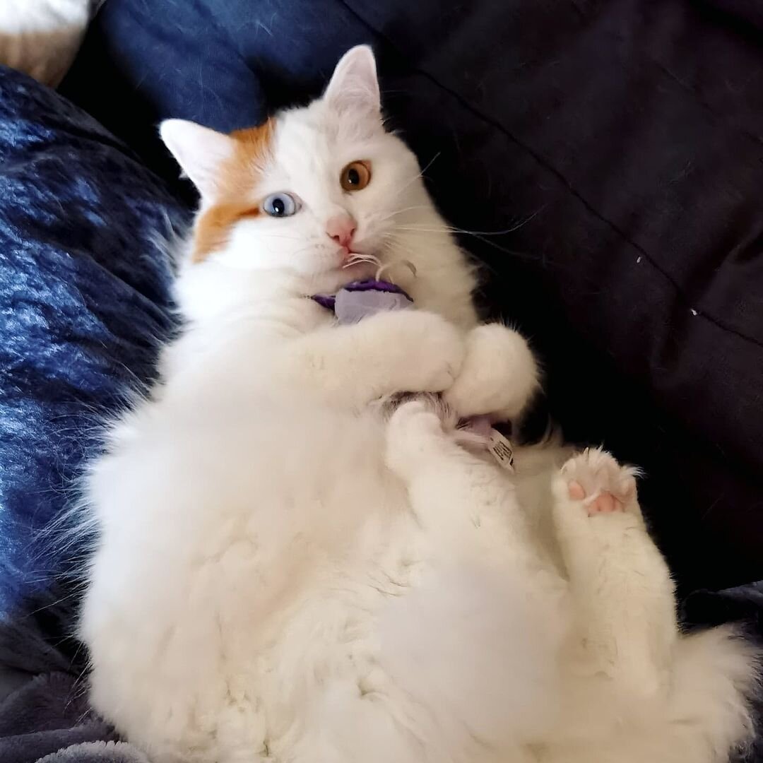 Здравствуйте, читатели! На очереди довольно интеллектуальная, но не особо распространённая порода кошек, а именно турецкий ван. Начнём с небольшой истории. Именно эта порода на своей родине, в Турции, звучит как "вана кату", что означает "кошка озера Ван". Если верить легендам, то эти кошки обитали на Ноевом ковчеге и были там охотниками на мышей. По пришествии на сушу к ними прикоснулся Аллах, тем самым благословил их. Считается, что в местах прикосновения шерсть приобрела коричневатый оттенок. У настоящих турецких ванов шерсть должна быть чисто белой, достаточно длинной и без подшёрстка. "Пятна" цвета обычно находятся на мордочке, от глаз до ушей. Глазки у них могут иметь или оранжевый или голубой цвет. Но существуют отдельные представители у которых один глаз голубой, а другой - оранжевый. На фото как раз одна из таких :) Эта порода до сих пор сохранила множество черт характера, со времён их обитания на дикой природе. В старые времена эти кошки были прекрасными рыболовами, эту черту