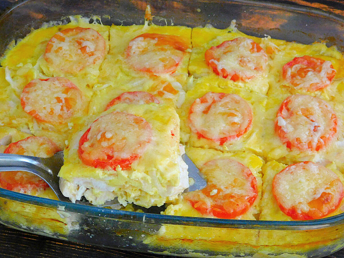 Приветствую всех, кто заглянул на наш кулинарный канал! Зачастую белое куриное мясо получается суховатым, поэтому сегодня предлагаем вашему вниманию рецепт из куриного филе, который позволит сохранить сочность и нежный вкус курицы. Блюдо не требует длительного маринования. Благодаря заливке из сметаны и яиц, куриное филе получается очень нежное и сочное. При желании можно добавить зелень или любимые специи. Продукты: куриное филе 800 г. помидор 2 шт. лук репчатый 1 шт. яйцо 4 шт. сметана 150 г. сыр твердый 150 г. соль 0,25 ч.л. перец молотый 0,25 ч.л. чеснок 1 зубец Как приготовить блюдо из куриного филе: Подготовить все необходимое. Для заливки разбить яйца, выложить сметану. Перемешать до однородности. Куриное филе нарезать довольно крупными кусками. Залить сметанно-яичной смесью. Добавить половину тертого сыра, нарубленный чеснок, соль и приправы. Смешать. Если есть возможность, оставить на 30-60 минут, чтобы мясо немного пропиталось. Форму для выпечки смазать маслом и присыпать ма