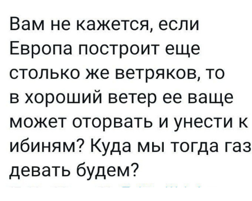 Пришло время прогуляться по соцсетям и почитать, что же произошло за последнее время в мире политики и дипломатических отношений. Да и просто узнать про отношение нашего общества к мировым проблемам. №1. А вот и первый интересный вопрос? Хотелось бы узнать мнение "великих учёных" про полезность ветряков и могут ли они оторвать Европу от земли. №2. Рынок, он такой. "Всё для людей". Только не всех, а тех кто поближе к распределения ресурсов. Держись Европа: "ЗИМА БЛИЗКО". №3. Вроде они же хотели независимости от нашей трубы и покупать газ на свободном рынке. А теперь всё, сдаёте назад? Оказывается на рынке дорого? №4. Это мы уже давно поняли. Мы мешаем всем, просто своим существованием. №5. Очередная премия уходит в какое-то политизированное действо. Скоро "премия Шнобеля" будет престижней и вне политики. №6. Давно проходили. Никому не интересен и не нужен, но все ждут его слов затаив дыхание. №7. Вот прямо про нас и соседей. И метко замечено, что младший даже не дурак. №8. Каким бы не б