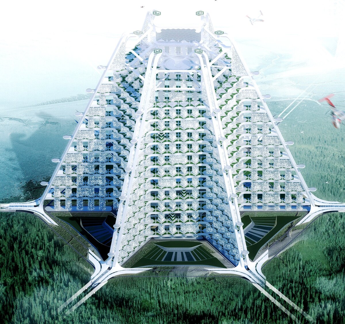 Такая, прямоугольная форма здания, более всего подходит для размещения различных офисов и складов, ведомств и фирм, обслуживающих как сам лифт, так и космопорт, располагающийся на верхней станции, уже на орбите в космосе.