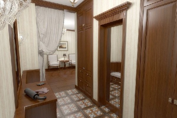 На полу лучше будет смотреться кафельная плитка, а не линолеум. Главное, чтобы потолок по стилю гармонировал с остальными комнатами квартиры. Это могут быть водно-дисперсионная краска, розетки, молдинг, такой же, как в зале. Оформление лепниной под боковое освещение подходит для прихожей и коридора.