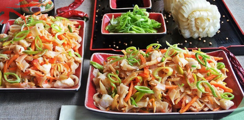 Ингредиенты: Предварительно размораживаем фаланги краба. Перекладываем замороженный продукт из морозильной камеры в холодильник. Затем кладем на бумажные полотенца. Очищаем от панциря и нарезаем. Рисовую лапшу заливаем кипятком и оставляем на 10 минут, после чего откидываем на дуршлаг. Очищаем морковь и нарезаем соломкой. Также соломкой нарезаем огурец. Чеснок очищаем от шелухи и натираем на терке. Берем миску, соединяем все подготовленные ингредиенты, добавляем специи для фунчозы. Ставим в холодильник на 2 часа. Блюдо готово. Приятного аппетита! Источник: https://wildcrab.ru/news?id=1309