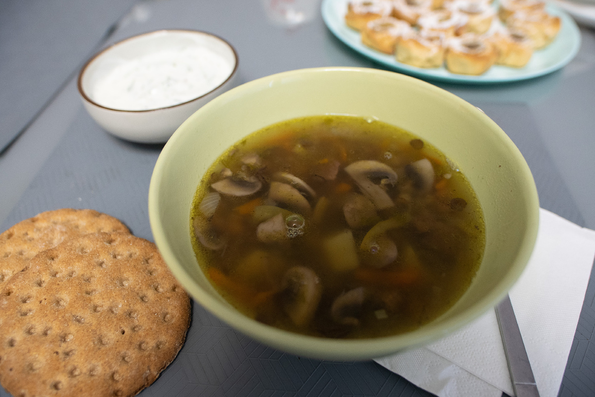 А к чаю? Медовые розочки с бананом! С каждым годом уменьшается количество людей, ежедневно употребляющих домашние супы. В любом супе содержатся мясо, овощи, зелень, специи, при варке все полезные компоненты переходят в бульон, а там содержаться и питательные вещества, и витамины, и минералы. Суп - очень питательное блюдо, его очень просто и легко готовить, к тому же пропорции можно брать любые и овощи, специи те, которым Вы отдаете свое предпочтение. У меня сегодня суп с шампиньонами и чечевицей. Сочетание отличное! Сначала готовим бульон, отвариваем мясо (лучше брать на кости, так бульон получается более наваристым), добавляем пару лавровых листов для аромата. Затем в бульон кладем чечевицу, ее количество зависит от размера кастрюли (у меня кастрюля на 3 л, я взяла где-то меньше половины стакана). Нарезаем шампиньоны пластиками, морковь и болгарский перец соломкой, лук мелким кубиком, обжариваем на сковороде, добавив немного растительного масла. В суп можно добавить небольшую картош