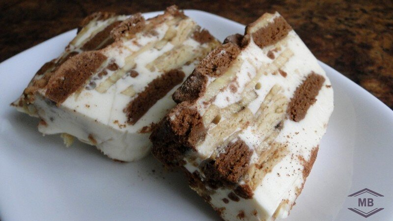В форму выкладываем в хаотичном порядке немного тёмного и светлого печенья. Высота слоя 0,5-1 сантиметр. Затем — слой нарезанных бананов. И снова слой из двух видов печенья, после — банановый слой. И так делаем до тех пор, пока не закончатся эти ингредиенты.