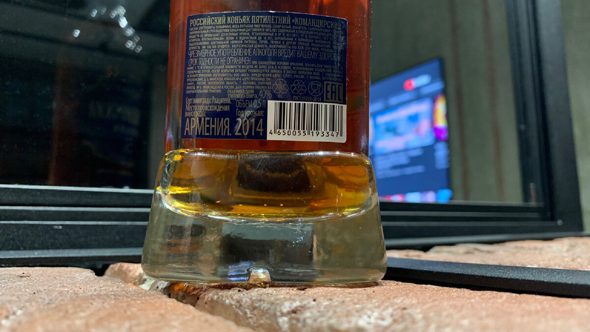 Большая оригинальная бутылка с толстым дном и треугольным сечением. Монументальный дизайн напоминает нос военного корабля или забрало шлема (будёновки). На синей этикетке по военному четко и ясно указано: Командирский коньяк пятилетний. Но удачная архитектура прибавляет возраст и объём. Пока не взял в руки, был убеждён, что это 7 лет в объёме 0,7🤦♂️ Кстати, напиток выбрала Ксения, чтобы «обмыть» наше приобретение - сверхтонкий TV 65”. Я давно наблюдал этот коньяк в продаже, но как-то не решался. А тут жена поставила перед фактом. Место производства - загадочный Коломенский Винно-коньячный Завод. До сих пор даже не слышал о таком. На контрэтикетке указан даже сорт винограда Ркацители, год сбора 2014 и страна происхождения Армения. Если сопоставить с датой розлива март 2021, то получаются те самые 7 лет! Под коньячок мы запекли говядину на рёбрах в плодовом ликёре. Причём два сорта в одном пакете. Одно мясо выдержанное в холодильной камере, второе свежее. За два с половиной часа мяс
