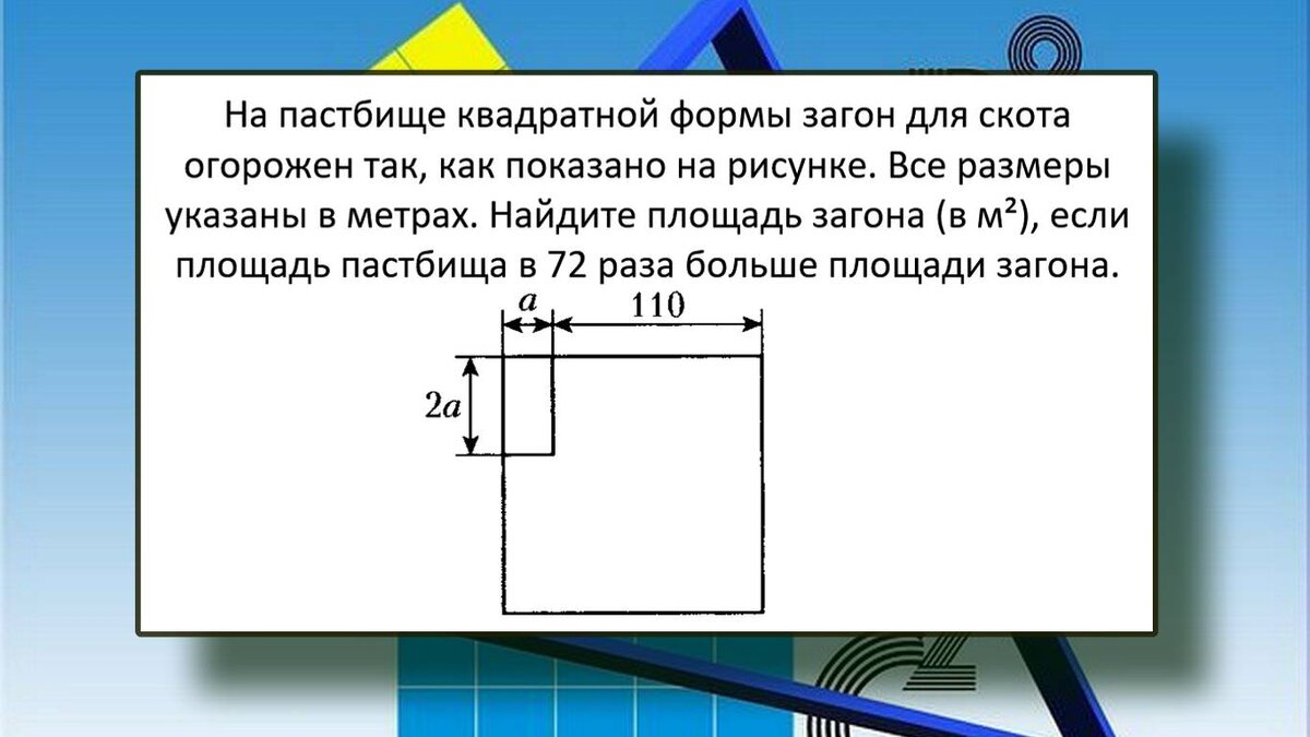 Длина стороны квадрата равна a + 110, поэтому его площадь будет равна (a + 110)². Это и есть площадь пастбища. Загон для скота представляет собой прямоугольник со сторонами a и 2a. Его площадь равна 2a². По условию площадь пастбища в 72 раза больше площади загона. Составляем уравнение: