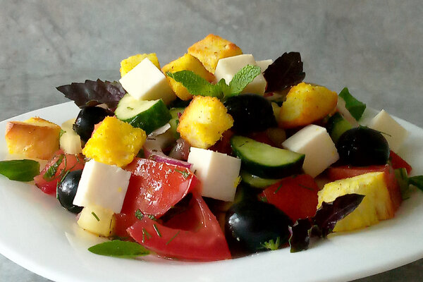 Греческий салат с брынзой и крутонами – разноцветный микс овощей, рассольного сыра, маслин и румяных сухариков. Рецепт этого яркого блюда немного отличается от классического варианта. Важным компонентом витаминного ассорти выступает слегка солоноватая брынза, способная объединить все составляющие в гармоничную вкусовую комбинацию. Немаловажную роль в предложенном блюде играют миниатюрные чесночные гренки. Хрустящие кубики белого хлеба служат интересным украшением, придают салату дополнительную сытность и визуальную значимость.