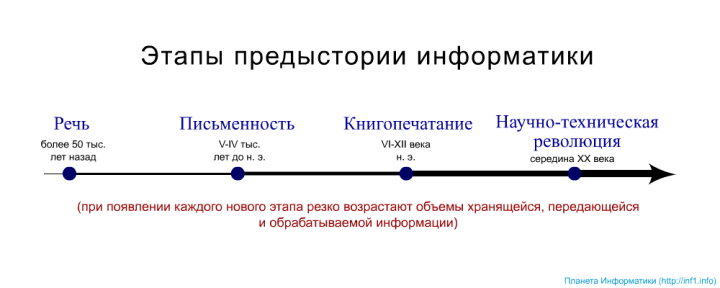 27 мая История информатики как науки началась со второй половины XX века. Это было связано с появлением и распространением ЭВМ и начавшейся компьютерной революцией. Появление вычислительных машин в 40-50-е годы создало для информатики необходимую аппаратную поддержку, то есть благоприятную среду для ее развития как науки.Однако, несмотря на свою короткую историю, информатика имеет длительную предысторию, связанную с особенностями накопления и обработки информации на разных этапах развития человеческого общества. Таким образом, всю историю информатики можно подразделить на два больших этапа: предысторию и саму историю. Предыстория информатики Предыстория информатики начинается с появления социального общества. В предыстории выделяют ряд этапов. Каждый из них характеризуется резким возрастанием по сравнению с предыдущим возможностей хранения, передачи и обработки информации. Первый этап – освоение человеком развитой устной речи. У древних людей членораздельная речь и язык, на котором он