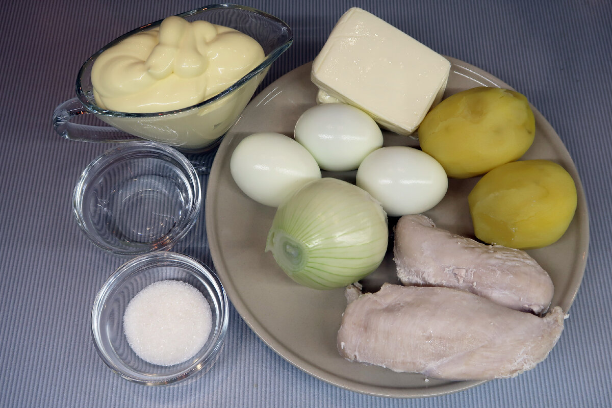 Приготовление слоеного салата Невеста не отнимет у вас много времени! Поэтому, если вы ищите простой, вкусный и недорогой рецепт салатика на праздничный стол, рекомендую обратить ваше внимание на этот замечательный салат! Для приготовления слоеного салата Невеста, нам понадобятся следующие ИНГРЕДИЕНТЫ: СЛОЕНЫЙ САЛАТ НЕВЕСТА С КУРИЦЕЙ И ПЛАВЛЕННЫМ СЫРОМ Видео приготовления: РЕЦЕПТ ПРИГОТОВЛЕНИЯ: Первым делом, нарезаем репчатый лук не очень крупно. Выкладываем лук в отдельную чашку. В чашку с луком добавляем сахар, уксус и все это заливаем кипятком. Все это хорошо перемешаем и даем хорошо охладиться. А пока займемся другими ингредиентами. Филе куриной грудки нарезаем небольшими кусочками. Картофель натираем на средней терке. Желтки отделяем от белков. Желтки натираем на мелкой терке, а белки натираем на крупной терке. Плавленые сырки натираем на средней терке. Чтобы они хорошо натирались, рекомендую поместить их в морозильную камеру на 30 минут. Теперь приступаем к сборке салата Невеста.