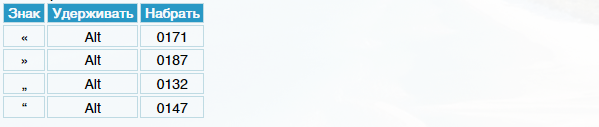 Для открывающей кавычки («) необходимо нажать и удерживать на клавиатуре Alt и набрать на правой дополнительной цифровой клавиатуре 0171, после чего отпустить кнопку Alt.