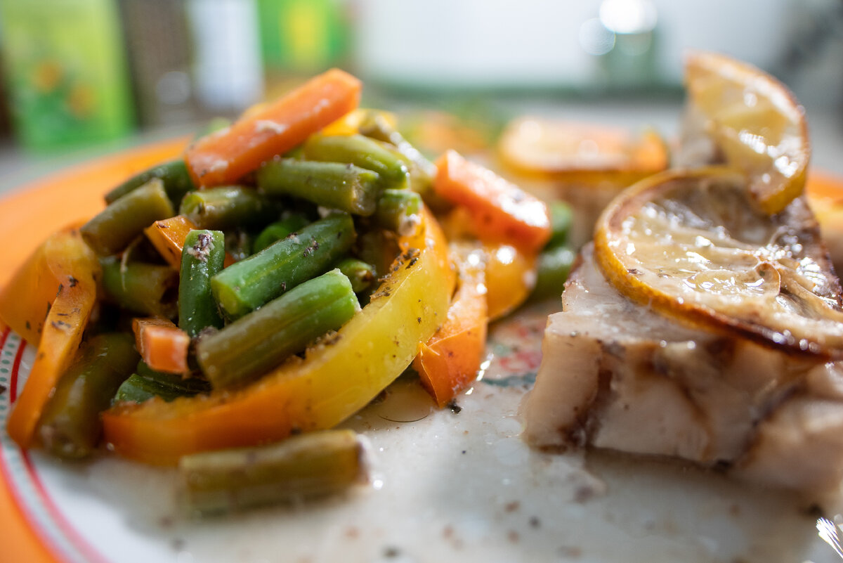 Полезный ужин – то, что нужно! Берем форму, слегка смазываем дно растительным маслом, кладем слой стручковой фасоли, свержу ломтики болгарского перца и моркови. Добавляем немного острого зеленого перца, нарезанного тонкими колечками, солим по вкусу, опрыскиваем бальзамическим уксусом. Минтай я взяла прессованный (можно взять филе другой рыбы), разрезала его на треугольники. Выкладываем рыбку поверх овощей, слегка подсаливаем, кладем дольки лимона на каждый кусочек и слегка опрыскиваем бальзамическим уксусом и растительным (оливковым) маслом. Ставим в духовку и запекаем при температуре 200 градусов в течение 30-40 минут до готовности. Рыба с овощами готова, приятного аппетита! Подписывайтесь на мой канал, пишите комментарии, лайкайте! #рецепты из рыбы #запеченные овощи #запеченная рыба #минтай в духовке #минтай рецепт #минтай с овощами #стручковая фасоль #блюда из рыбы #рыбные блюда #овощи в духовке