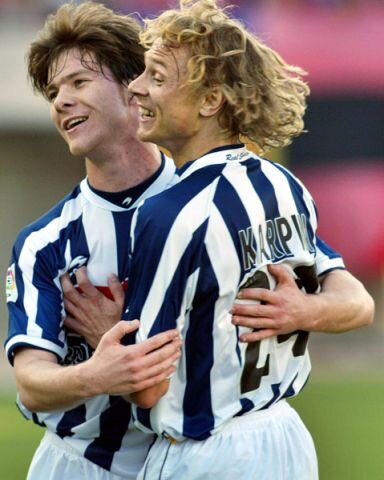 Валерий Карпин забивает победный гол в ворота мадридского «Реала» в 2004 году. Сыграл в штрафной как образцовый центральный нападающий! А поздравляет Карпина 22-летний Хаби Алонсо!