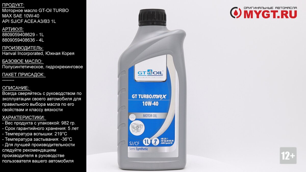 Продукт: Моторное масло GT-Oil TURBO MAX SAE 10W-40 API SJ/CF ACEA A3/B3 1L Наш телефон: 8-800-550-57-22 ПН-ПТ 9.00-17.00 (МСК+4) Артикул: 8809059408629 - 1L 8809059408636 - 4L Производитель: Hanval Incorporated, Южная Корея Базовое масло: Полусинтетическое, гидрокрекинговое. Пакет присадок: -------- Ссылка для покупки: https://mygt.ru/Oil/selection/gt-turbo-max-10w-40-1-l.html Высококачественное всесезонное полусинтетическое моторное масло, отвечающее современным требованиям автомобилестроения. GT Turbo Max разработано на основе передовых технологий - гидрокрекинговых базовых масел высокой вязкости и современных присадок. Обеспечивает уникальные эксплуатационные характеристики: увеличивает срок службы двигателя при высокой экономии топлива. Соответствует требованиям европейских стандартов ACEA A3/B3 и американских стандартов API SJ/CF. Обеспечивает стабильно высокие защитные свойства при обкатке и в основной период эксплуатации двигателя. Гарантирует экономию топлива за