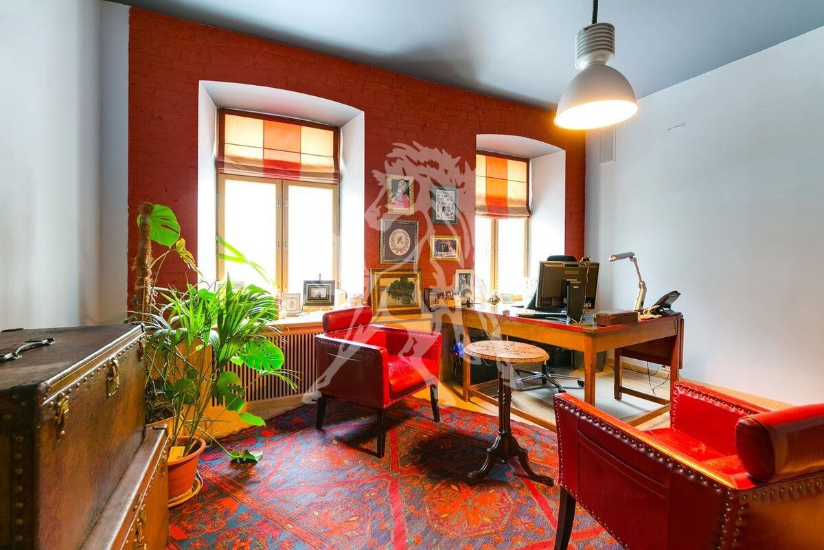 Для продажи предлагается уникальная двухуровневая квартира-бюро на первом и цокольном этаже с окнами, собственным розарием и действующим камином. Бюро получило признание журнала «Forbes». Арт-помещение разделено на несколько зон: рабочая, гостевая и приватная. В интерьере в стиле loft сохранены и отреставрированы элементы арочных перекрытий и кирпичной кладкой в 1,5 метра. Есть три независимых входа в квартиру (один парадный, два второстепенных) и возможность установить лифт. Стоимость этого лота можно узнать на сайте Kalinka.